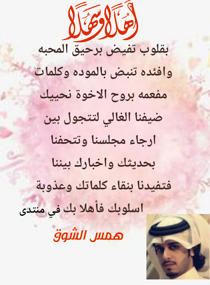 رد: دعونا نرحب بضيفنا الجديد ابن البادية اهلآ وسهلا بكم في همس الشوق سعدنا بانظمامك معنا بنتظار جديدك بكل شوق ودي وعبير وردي |